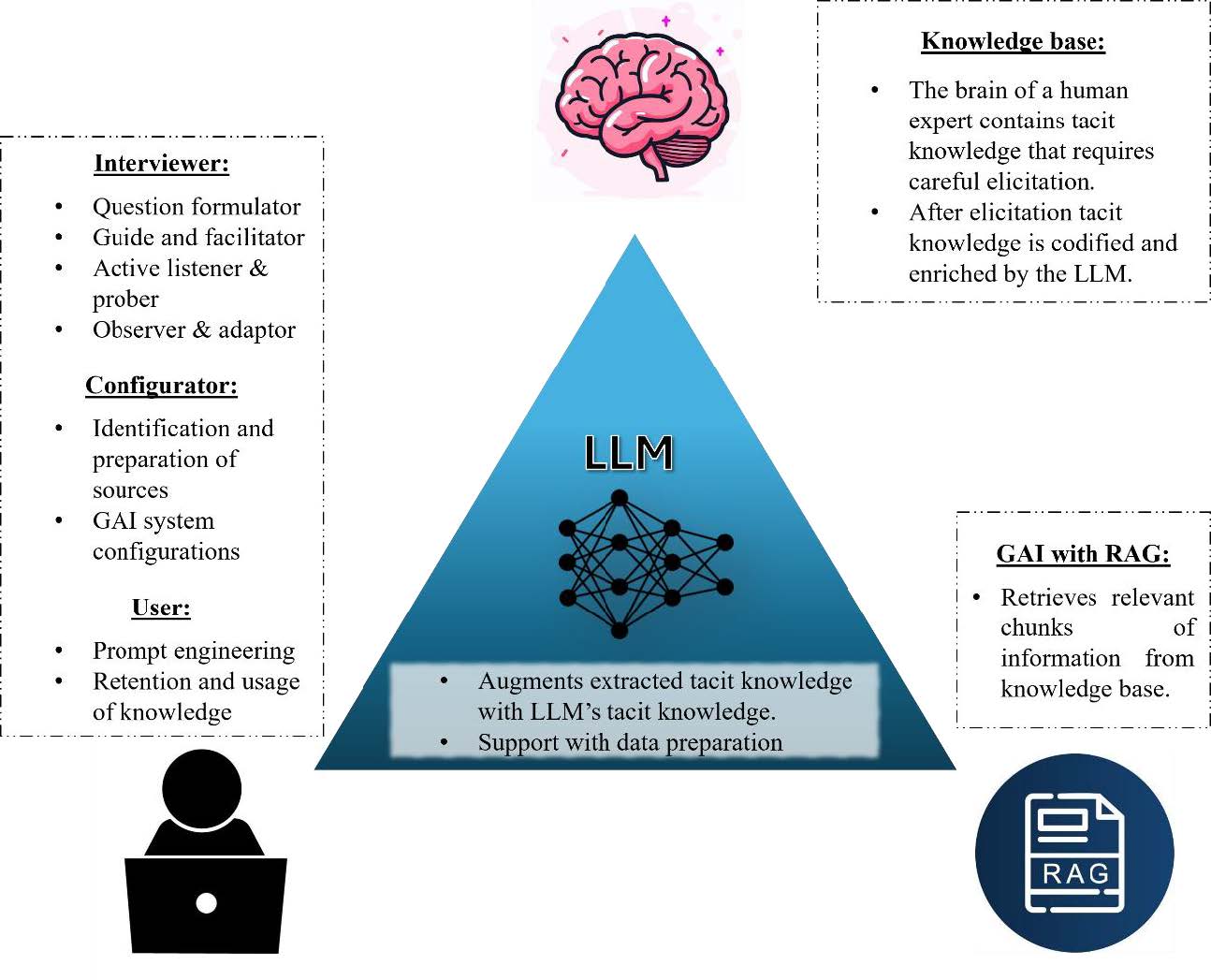 The loss of tacit knowledge, constituting the majority of organizational knowledge, significantly impairs an organization’s ability to compete. Traditionally, research and practice have focused on preventing knowledge loss through human- and technology-centered strategies. Nowadays Generative Artificial Intelligence (GAI) is disrupting many industries and brings a great paradigm shift for knowledge management. In particular the Retrieval Augmented Generation (RAG) capability emerges as a promising solution to combine the world knowledge of Large Language Models (LLMs) with domain-specific knowledge of companies.