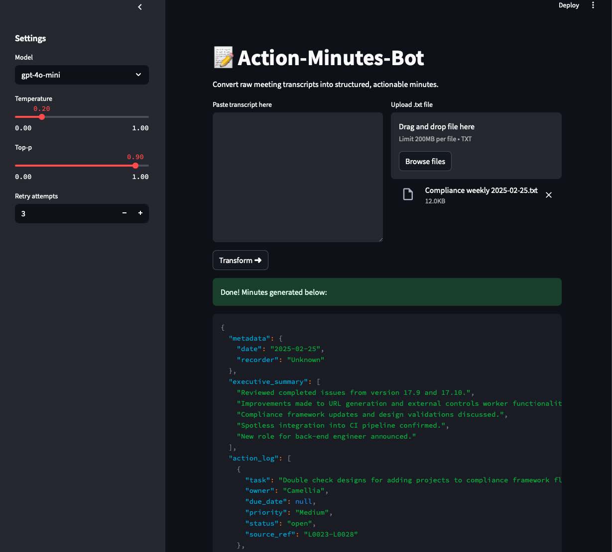 By comparing these different versions, the research seeks to determine whether prompting strategies and schema-guided output formats enhances the AI's ability to produce clear, complete, and actionable meeting summaries. The findings are expected to contribute to both academic knowledge and practical applications, offering insights into improving AI-assisted meeting documentation. This could lead to increased efficiency and accountability in organizations by leveraging AI technologies to generate high-quality meeting minutes from transcript data.