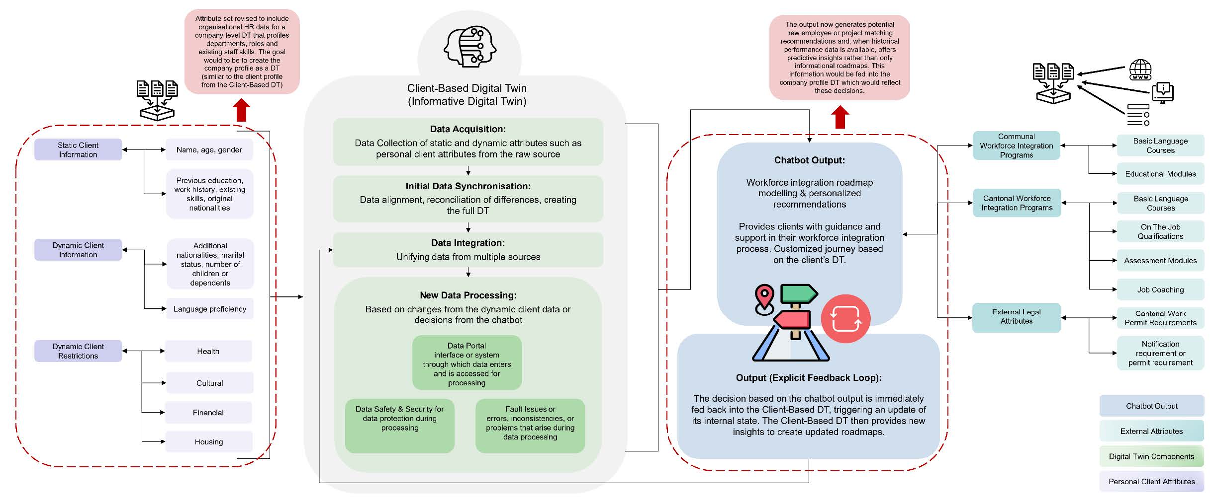 Through an iterative approach, the ABILI chatbot tool was tested based on the use case of workforce integration. The evaluation criteria included user trust, task efficiency, personalization, and reduction of manual effort. Integration coaches, clients, and domain experts participated in the evaluation interviews, offering feedback that informed subsequent iterations. The results indicate that the tool significantly reduces time spent on repetitive tasks, improves alignment with client needs, and supports the standardization of procedures without undermining professional autonomy. The interview participants emphasized the value of real-time adaptation, structured decision support, and accessible output formats. Ethical concerns, particularly regarding data privacy and algorithmic transparency, were addressed throughout the design and evaluation process. The conclusion highlights the strengths and weaknesses of the re-search process and provides learnings based on the authors reflection, a summary of the re-search questions and answers and areas for future research. The Client-Based DT is not con-fined to the field of workforce integration but can be applied in any context where the persona of a client, individual or organization is central and affected by specific external changes.