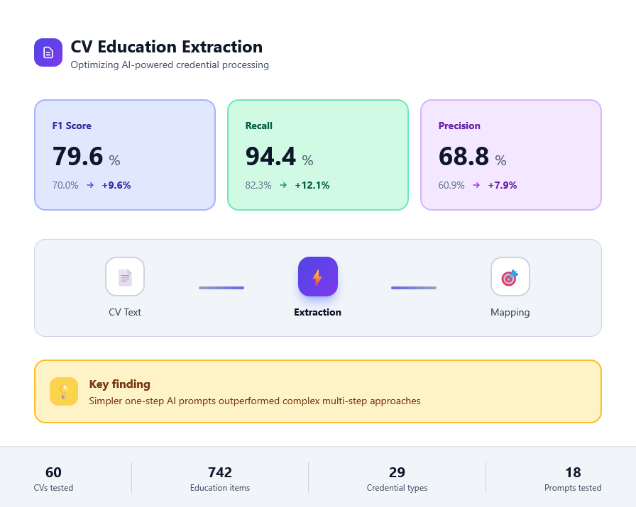 Part of the Innosuisse-funded "Talent Track Pro" project, this thesis optimizes AI-powered education credential processing for recruitment, improving how candidate qualifications are identified from CVs. Key finding: simpler AI prompts outperform complex ones.