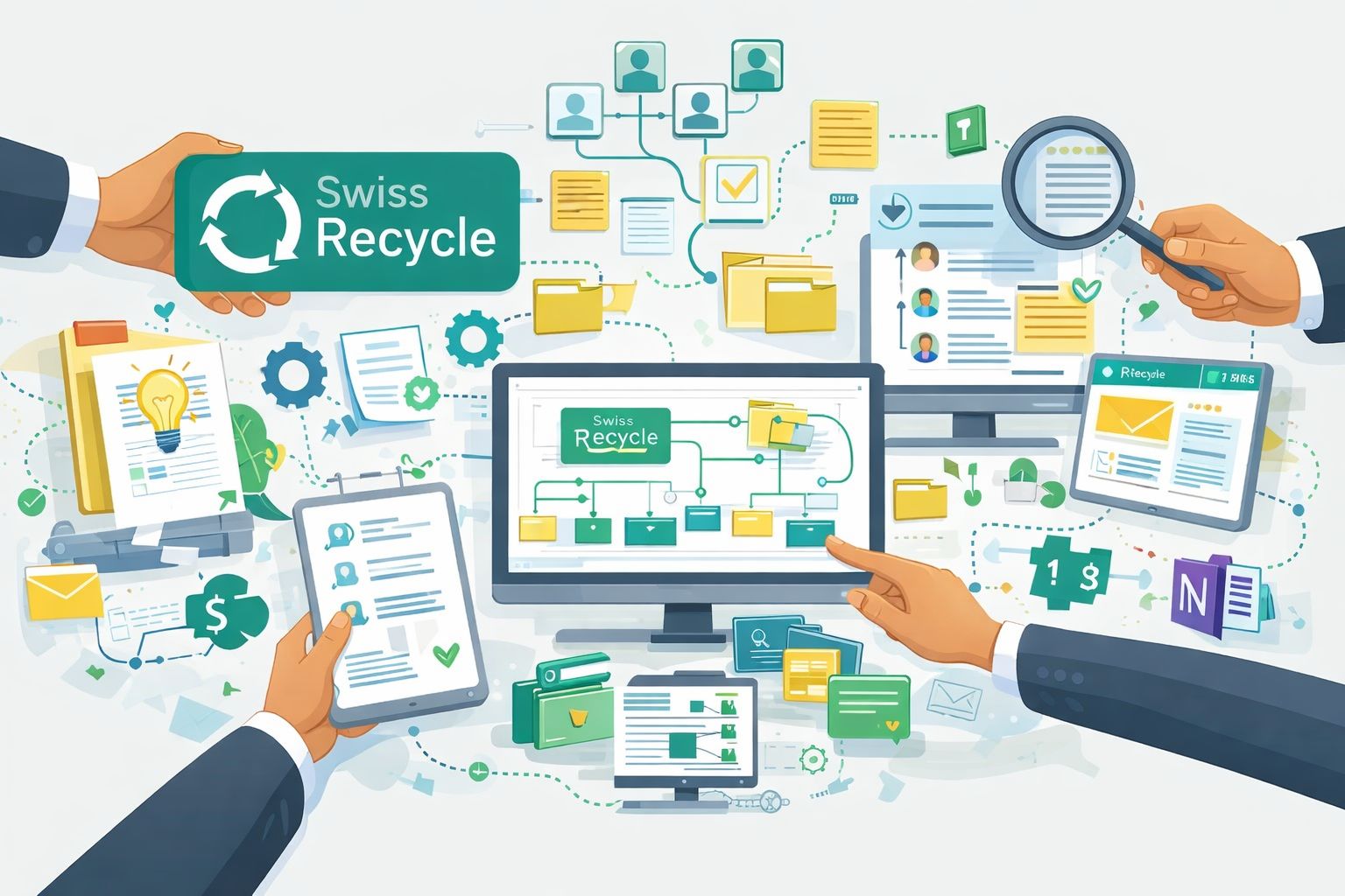 Swiss Recycle arbeitet als kleiner, digital organisierter Non-Profit-Verein mit SharePoint, Teams, OneNote und einem internen Wiki. Trotz dieser Toollandschaft fehlen eine einheitliche Ablagelogik und klare Zuständigkeiten. Dokumente sind teils mehrfach vorhanden, unterschiedlich benannt oder nicht aktuell. Wissen wird häufig informell weitergegeben, was besonders bei Einarbeitungen in der Zusammenarbeit zu Ineffizienz führt.
